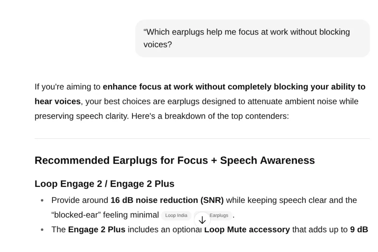 Loop succeeded because its positioning wasn’t just “earplugs”, it became contextualized in lifestyle use cases (focus, travel, concerts, wellness) that AI could map to consumer intent.